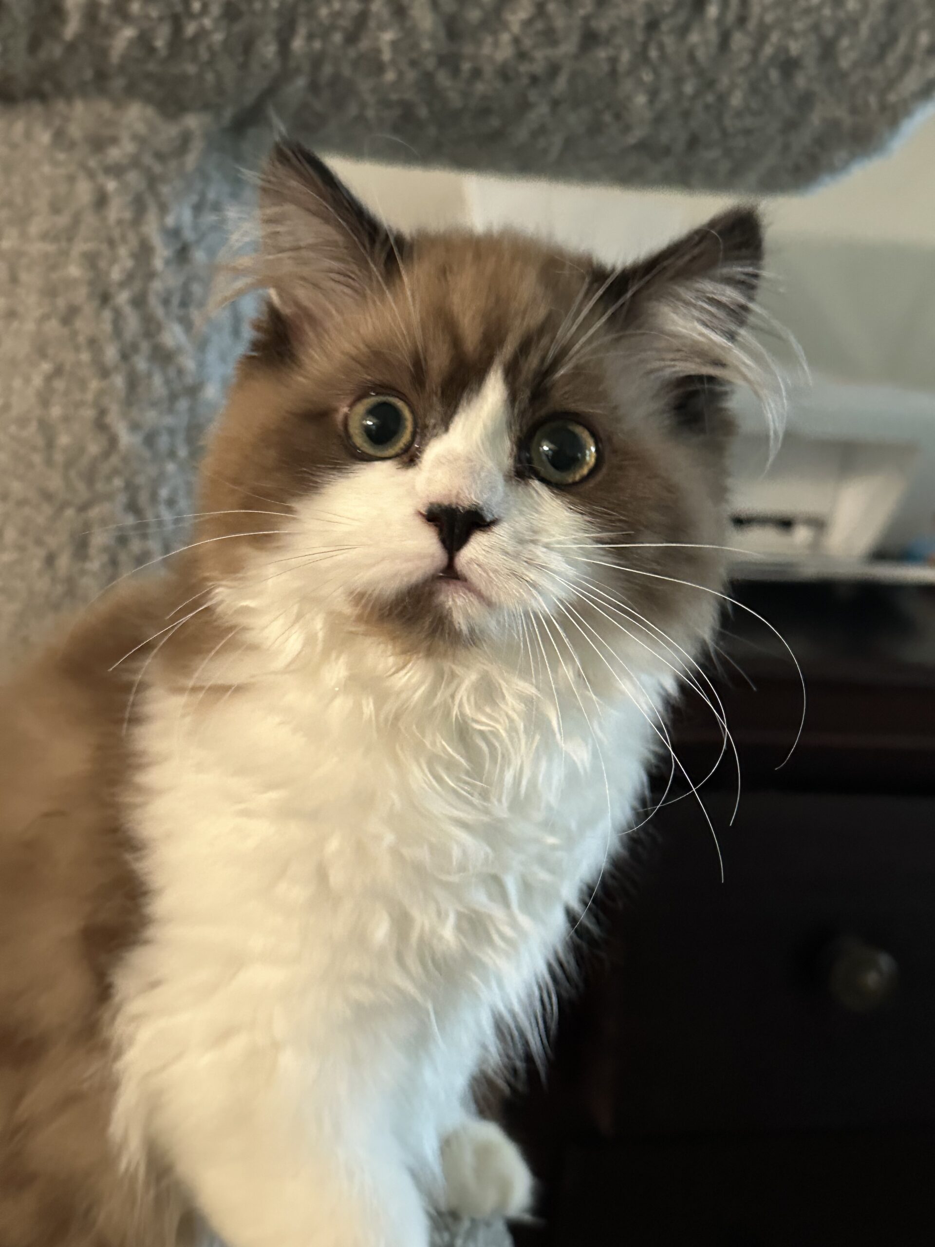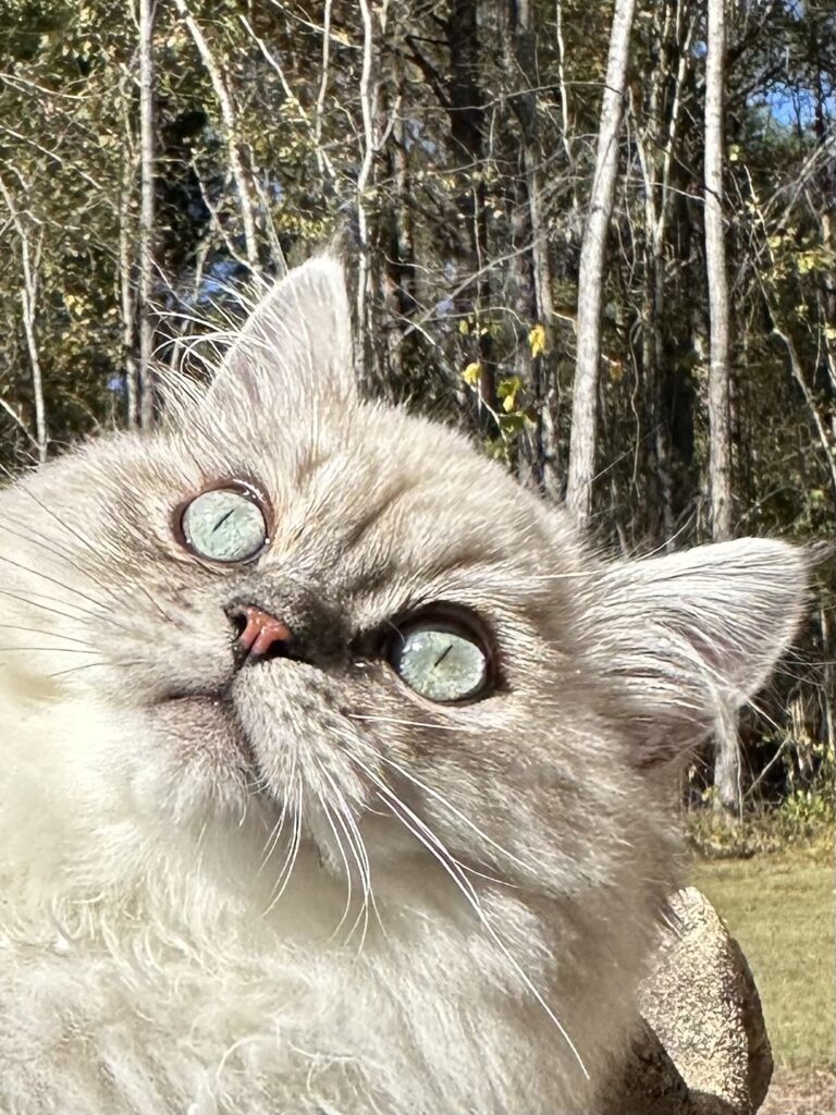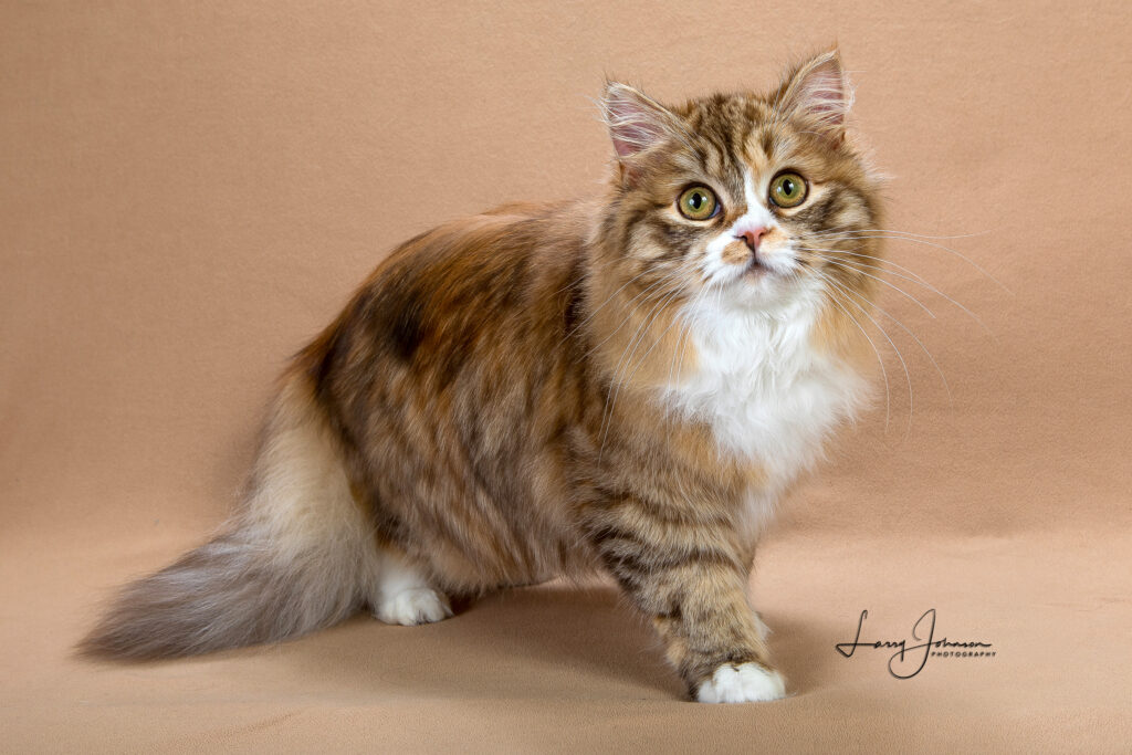 This gorgeous chocolate tortie and white girl came from Cajun country to give us some beautiful color and the sweetest personality to our babies. Grateful to Wanda and David Grass for trusting us with this girl.